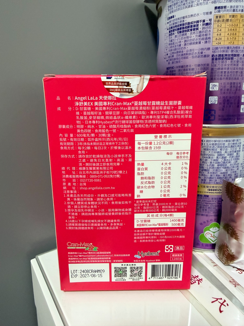 這次實際體驗 Angel LaLa天使娜拉 專利蔓越莓淨密呵護系列 的蔓越莓甘露糖益生菌膠囊,